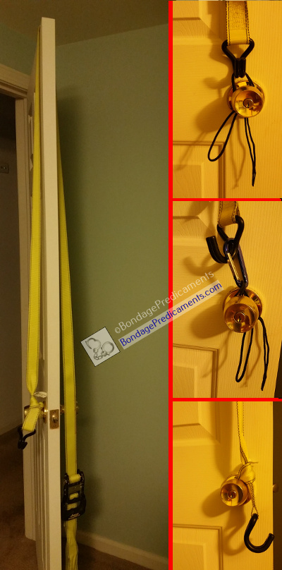 - Hook or clip your sub's tied/cuffed hands to the ratchet strap hook hanging down behind him.